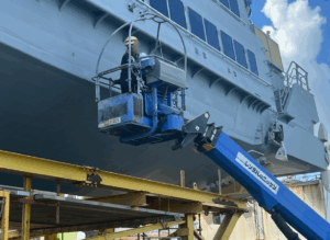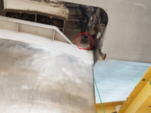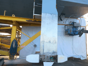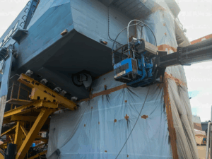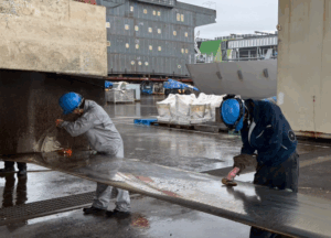現在、船体後部でブラスト作業を進めています。ブラスト作業とは、金属の表面をきれいに整える工程で、次に行う「液体浸透探傷検査(PT 検査)」の大切な準備となります。 PT検査は薬品を使って金属表面を調べ、小さなヒビやキズが […]